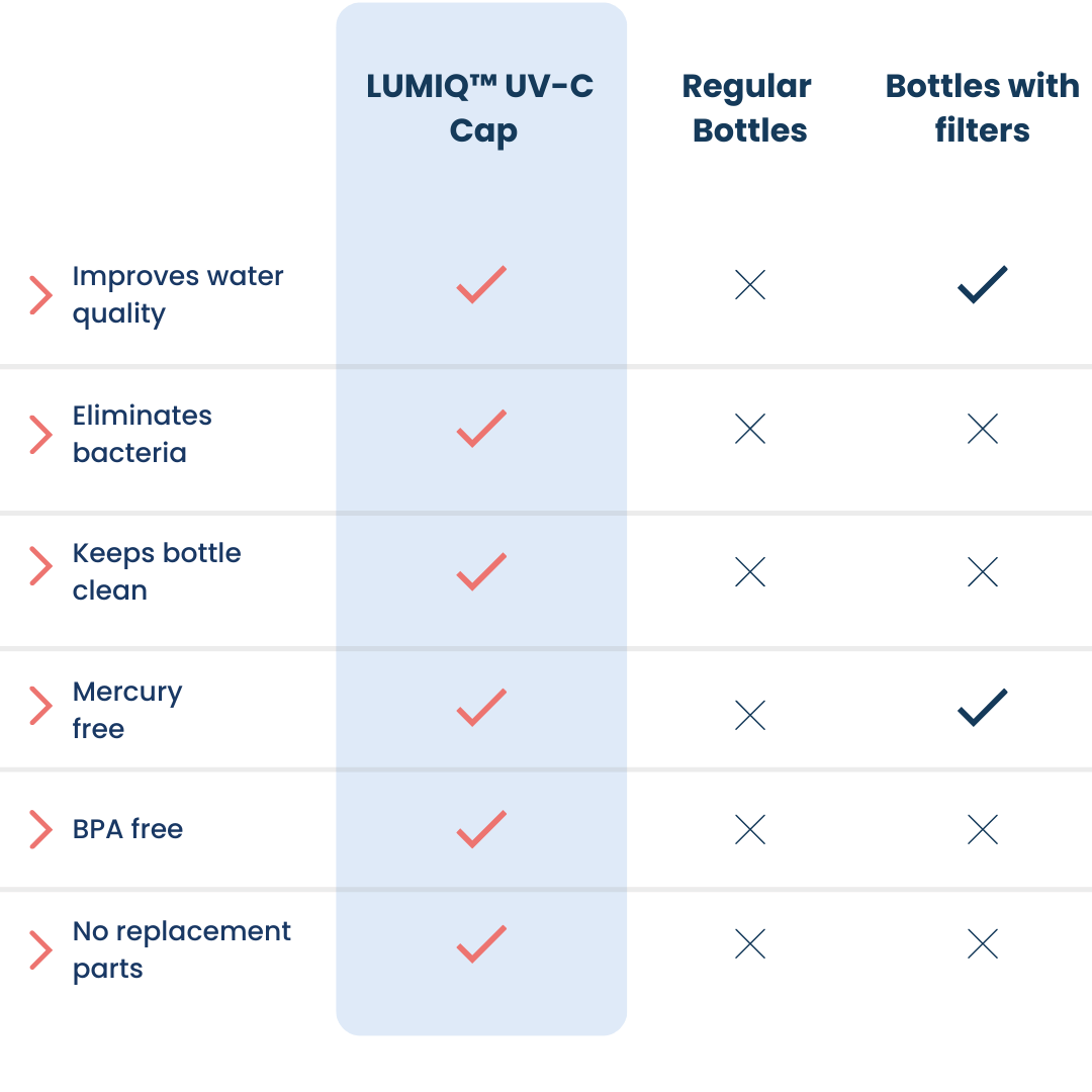 LUMIQ™ UV-C Light Lid redefines water purification with cutting-edge design and superior functionality. Equipped with 4 high-performance UV-C LED lights, our cap delivers unparalleled purification by deactivating up to 99.99% of harmful microorganisms in just 60 seconds. Unlike traditional water bottles or filters that only improve taste or remove particles, LUMIQ™ UV-C lid actively sanitizes water at a molecular level and even prevents bacterial buildup on bottle surfaces.