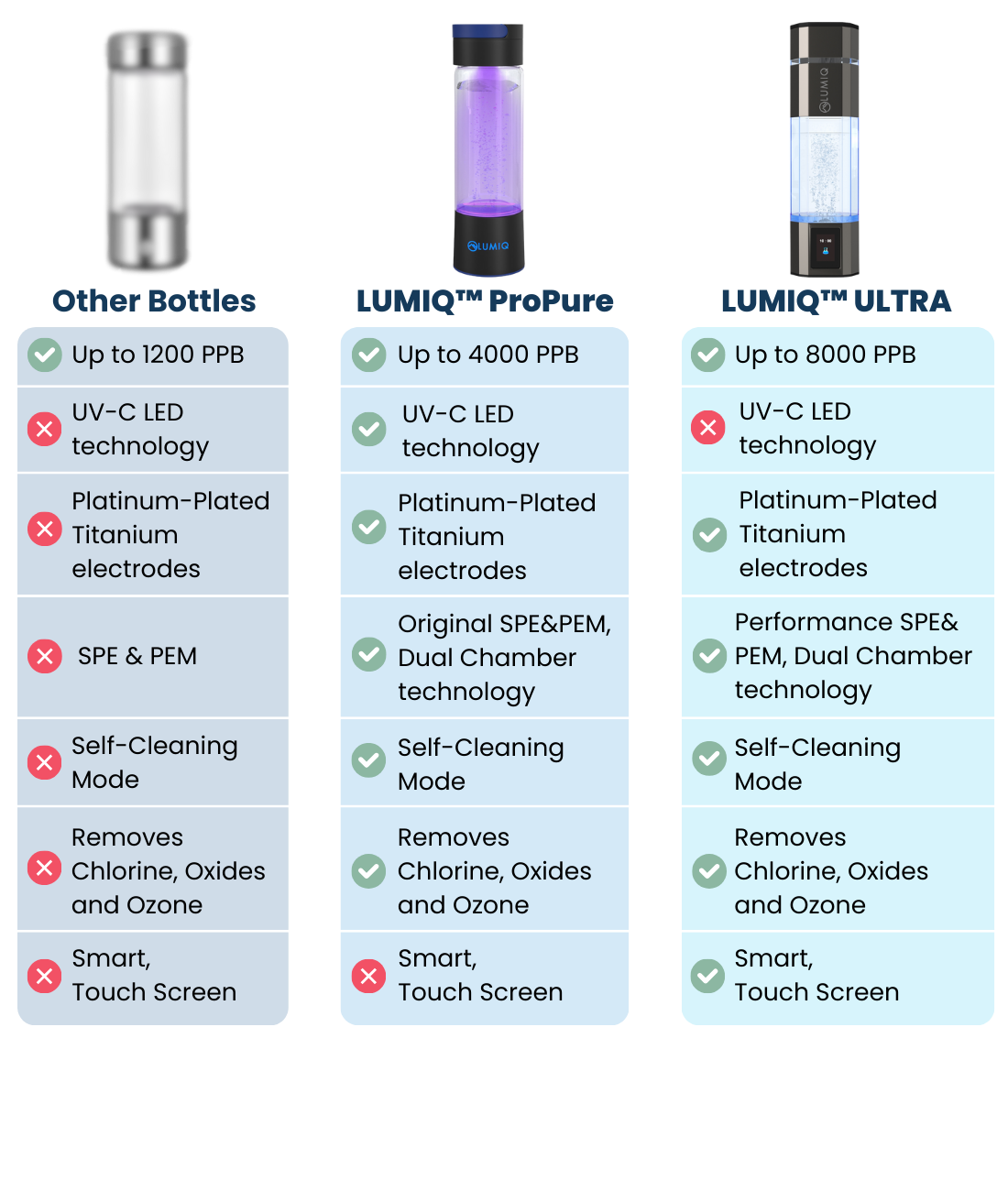 LUMIQ® hydrogen water bottles feature premium technology that infuses water with high levels of molecular hydrogen while filtering out substances like chlorine, ozone, and other contaminants. Our LUMIQ® ProPure takes hydration to the next level by incorporating 4 high-performance UV-C LED lights, actively eliminating harmful microorganisms. This combination of advanced hydrogen infusion and superior UV-C purification ensures a clean, refreshing taste and purer water, setting LUMIQ apart from cheaper alternatives and providing an unmatched hydration experience.